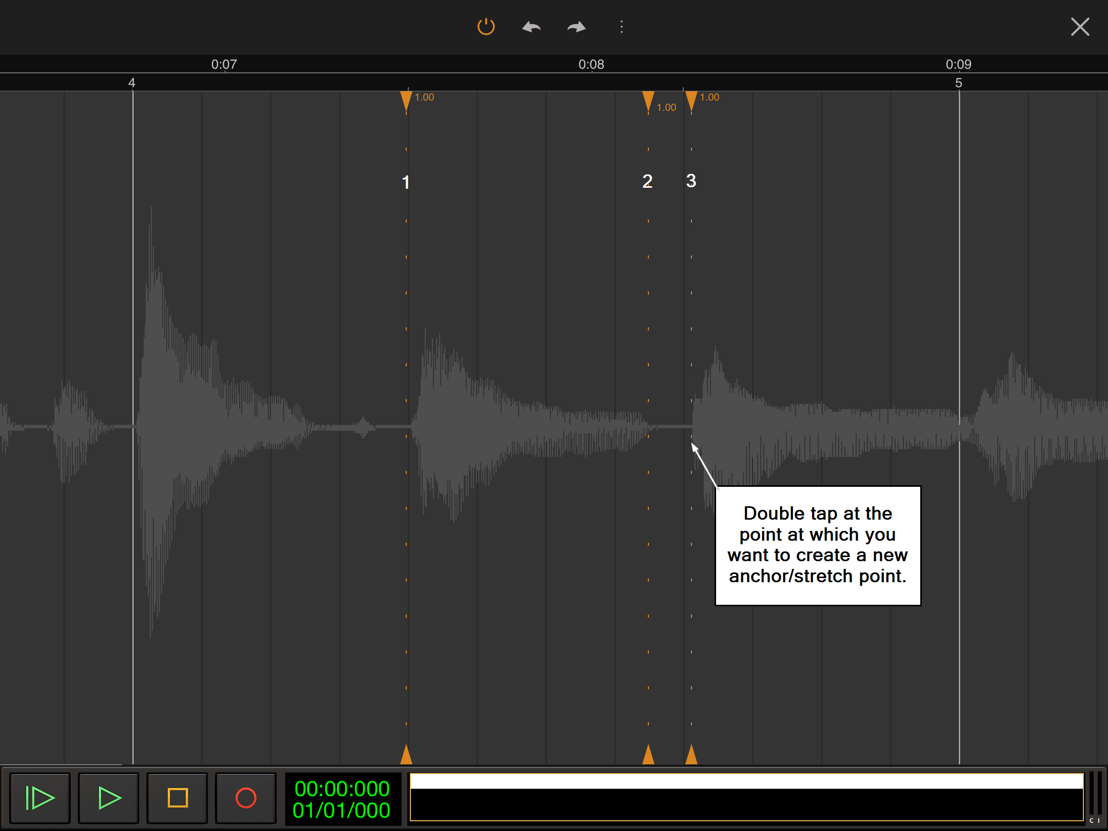 Anchor/stretch points are placed by double tapping at the points at which you want them to be created. Zooming into your audio gives you much more control of this process. If you place one in the wrong place, simply use the Undo button immediately or double tap on it again at any time to remove it.