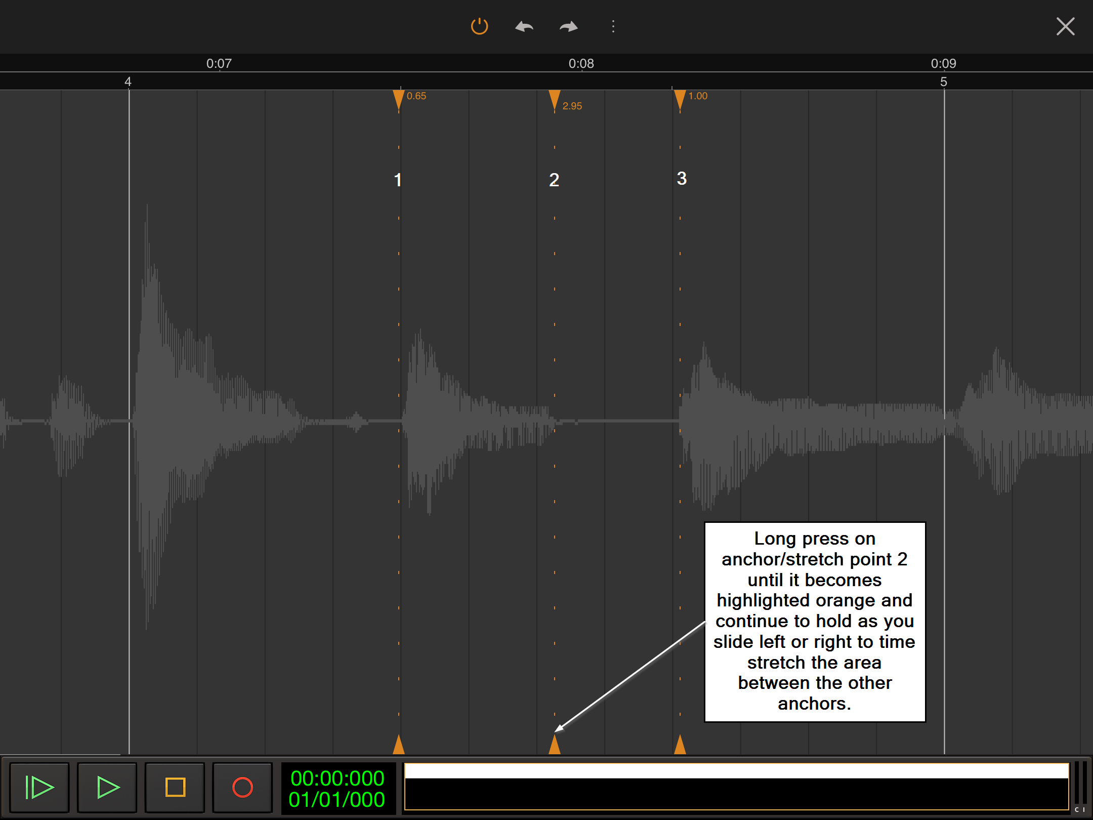 In the screenshot above, anchor/stretch point number 2 has been long pressed until its vertical line has become a solid orange line and, whilst continuing to hold, slid to the right. This has increased the duration of the audio between anchor/stretch points 1 and 2 and shortened the duration of the very quiet audio between 2 and 3.