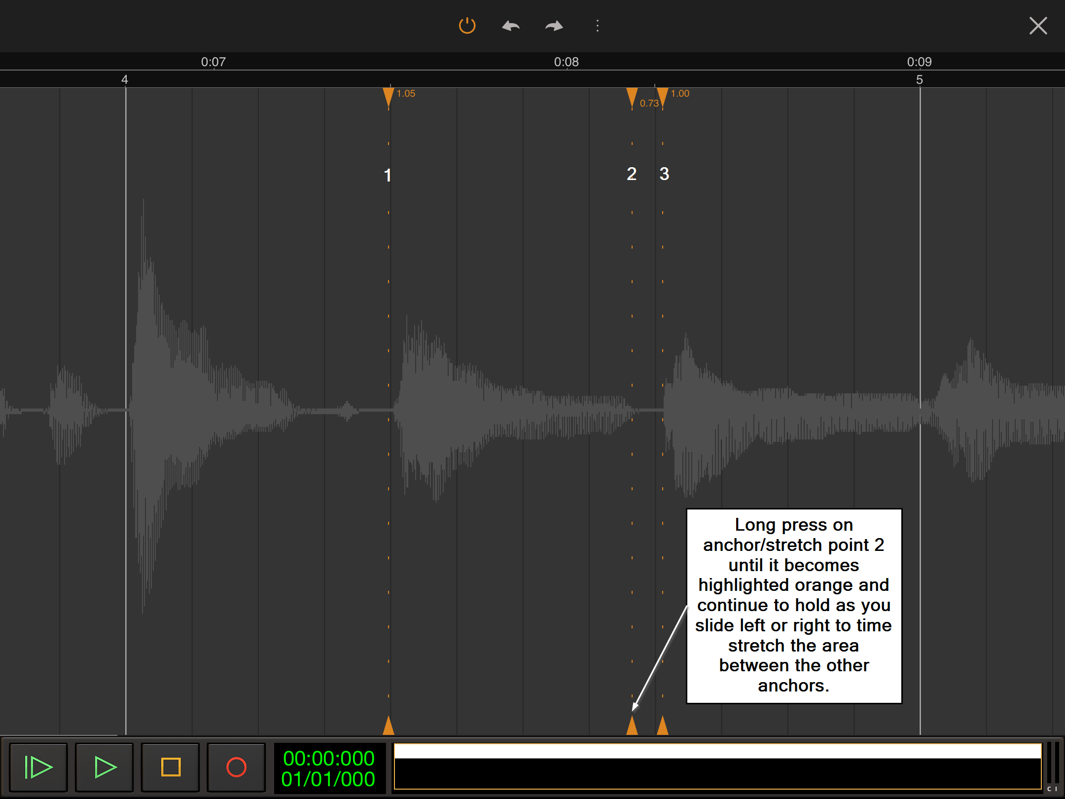 Anchor placement in Time only mode is the same as the Pitch and Time mode's 'None' option for auto placement (except there are no notes to be snapped to). As such, all anchor/stretch points must be manually created by the user by double tapping at the desired position within the waveform display area. This being the case, it is especially important to remember to place anchors on either side of your desired stretch point to ensure that you only time stretch the part of your audio you want to rather than stretching everything using the start and end of the clip as de facto anchor points (unless that's what you want to do). Remember that the Undo option is always there if you place an anchor/stretch point in the wrong place, that you can double tap on existing anchor/stretch points to remove them and there is also the Remove all stretch points option available via the Three Dot Button