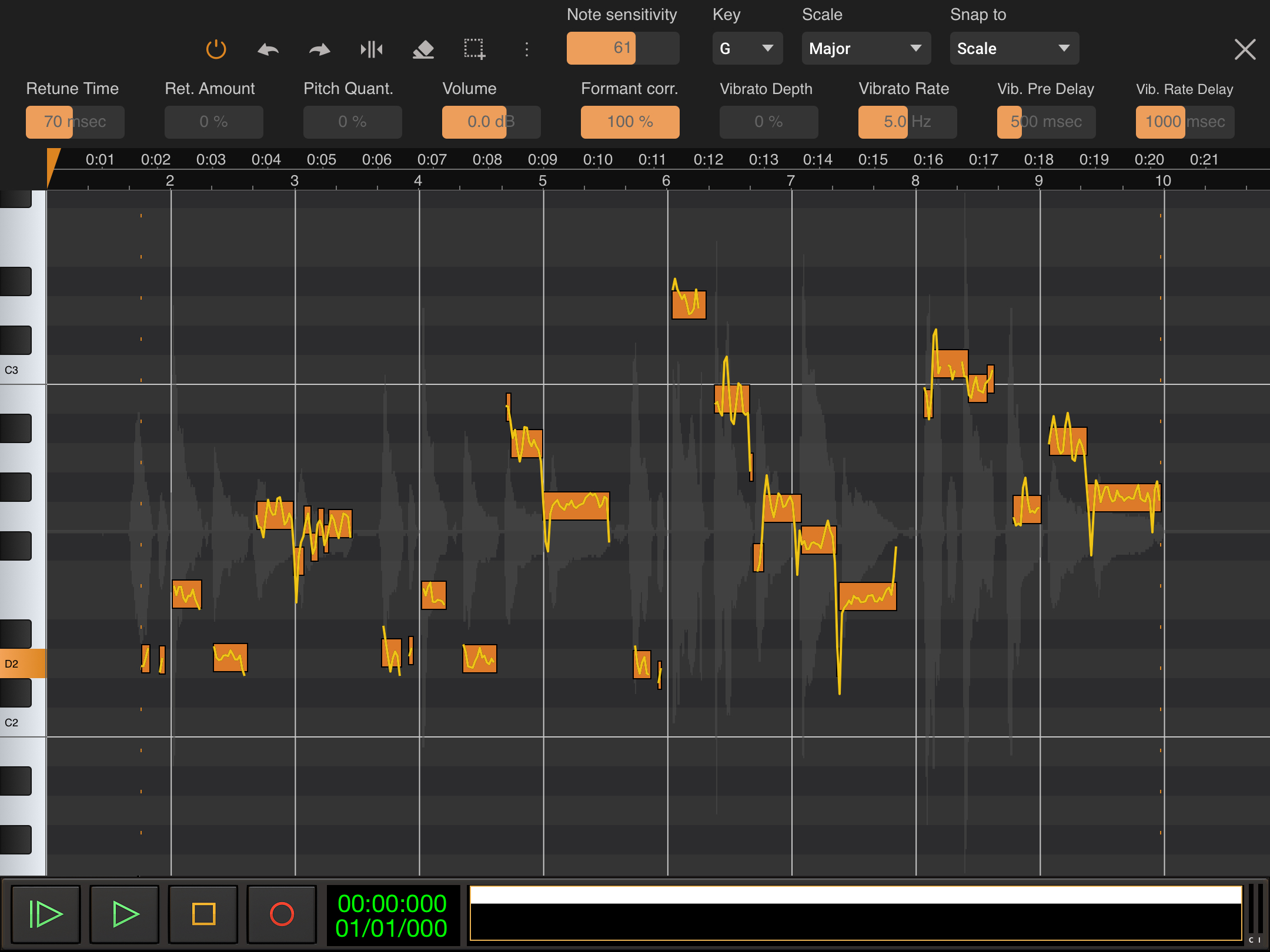 Though similar results can be achieved using the 'Free' Snap to mode and Retune Amount in the default Pitch and Time mode, in this mode, the interaction between Pitch Quantization and Retune Amount gives you more control overall for subtle retuning whilst maintaining the original performance fluctuations and corrected to the key and scale. Within the default mode, a Retune Amount of 0% will give you the original pitch as originally sung with all of its fluctuations. Increasing the value of the Retune Amount slider will incrementally remove the fluctuations until, at 100%, it will retune the vocal to exactly the quantized pitch, smoothing out all of the original fluctuations. In this 'Start without retuning' mode, however, because you can carefully set the target pitch for retuning using the Pitch Quantization slider first, you can retune to that target pitch AND have all of the fluctuations of the original performance still present (if desired) whereas the default mode can, generally speaking, only have that 'all fluctuations' state for the original pitch as sung.
