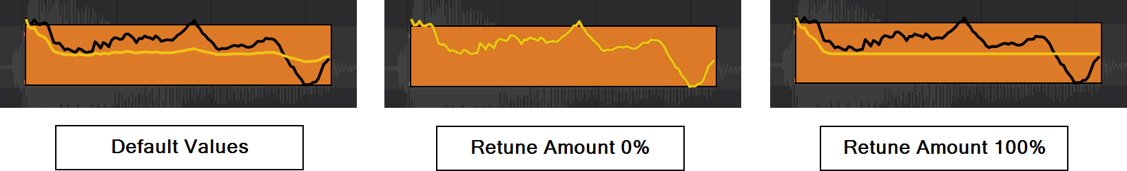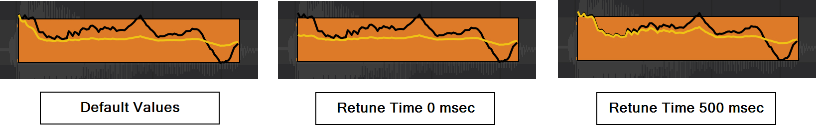 Above, you can see how the yellow retuned pitch line reacts to changes in the Retune Time (all other parameter values are left at their default settings). When the Retune Time is set to 0 msec the yellow pitch line immediately retunes the pitch at the beginning of the note. When the Retune Time is set at its maximum 500 msec, you can see how it starts off the same as the black detected pitch, no retuning applied, and is gradually retuned away from this as the Retune Amount selected is applied.