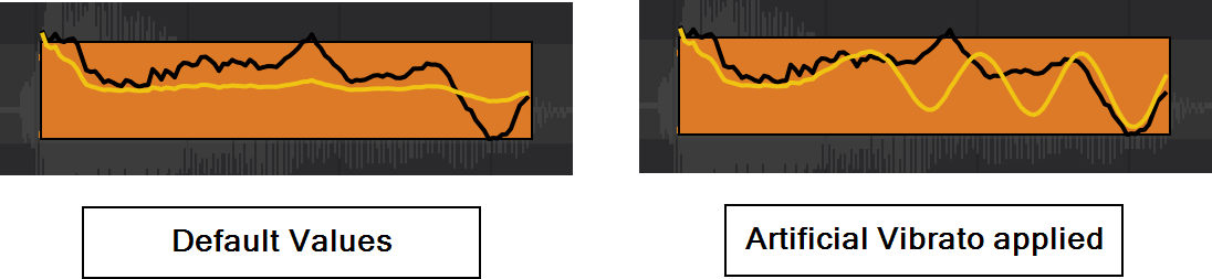 So, in the example shown on the right above, you can see how artificial vibrato is being gradually applied to the retuned yellow pitch after a short delay. Values for this example were chosen just to allow artificial vibrato to be illustrated on such a short note but they were