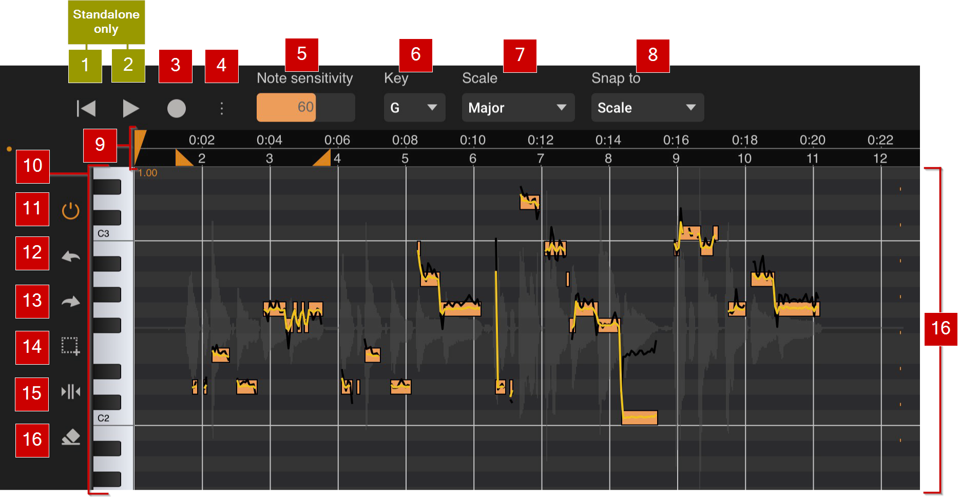 17 Timeline Area/Piano Roll Grid/Waveform display area. Scroll horizontally and vertically with one finger. Pinch/pull with two fingers to visually re-scale items within this area as required.