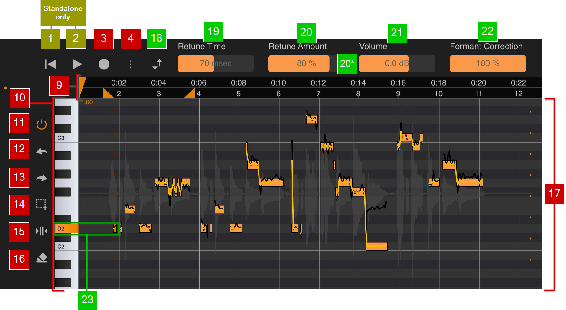 NOTE. There are no Time Marker or Loop Markers available in the timeline of Vocal Tune Studio AUv3 plug-in version as this functionality is controlled within the host app.