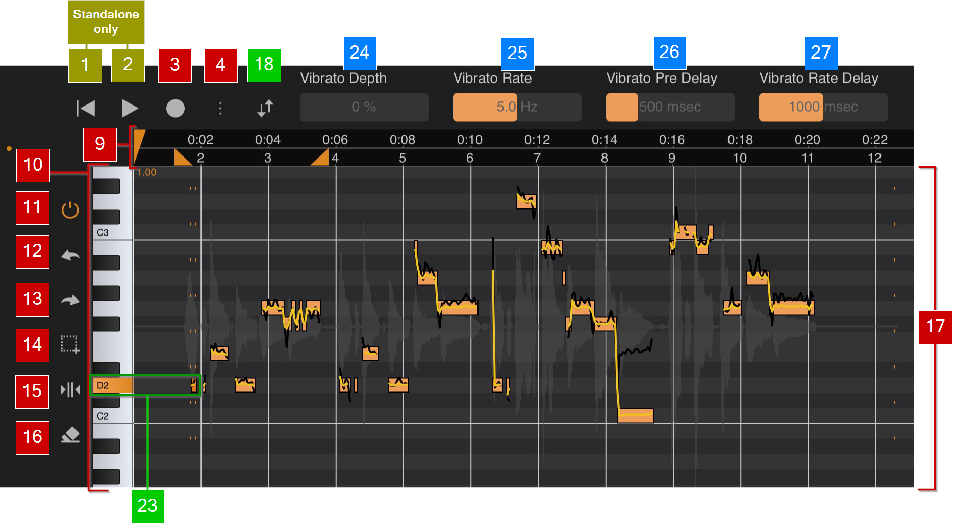 . Individual notes on the piano roll can be selected by tapping on them, which then allows you to move the note on the piano roll and refine the parameters (numbers 19 to 27) for that individual note event. Multiple contiguous notes can be selected by long pressing on the piano roll and sliding left or right until the highlighted area covers all of the notes you require at which point you can release and the parameters can be changed for those selected notes and those notes can be shifted in pitch on the piano roll while keeping their original tonal relationship to each other. If, however, you want to transpose or set those parameters for all of the notes you can quickly do so by pressing the Select All button. As such, it can be useful to initially select all and set up your preferred general setting for the tuning parameters for all of the notes. Once that is done to your satisfaction, you can then select a smaller subset of notes, or individual notes, to fine tune those parameters as required to get the perfect performance results.