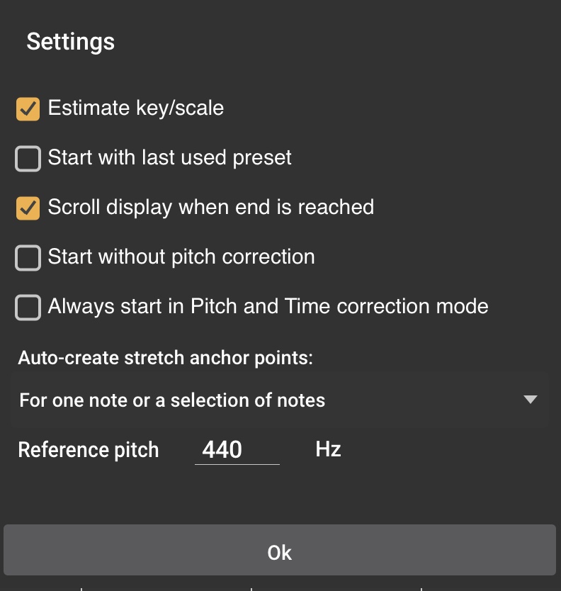 NOTE. If you would prefer Vocal Tune Studio not to estimate the key and scale of your audio so that it will always open in chromatic mode, this can be done via the Settings.