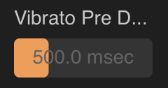 . Vibrato Pre Delay defines the amount of time before any vibrato is applied to the retuned pitch of any selected note or notes meaning you can start the note without any vibrato and have it gradually appear further through the retuned note. This parameter can be set between 0 milliseconds (no delay, vibrato is immediately applied) all the way up to 2000 milliseconds (2 seconds) though obviously you need a note which is longer than 2 seconds for the effect of this to be heard. The default value is 500 milliseconds. Double tap on the slider to either Reset to the default value or enter a value using the onscreen keyboard.